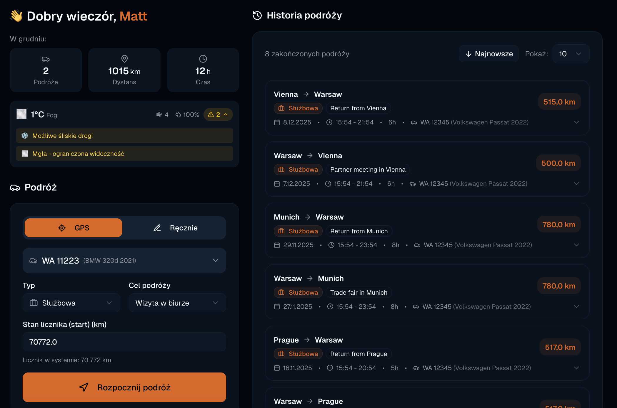 Autokilometry - Panel kierowcy